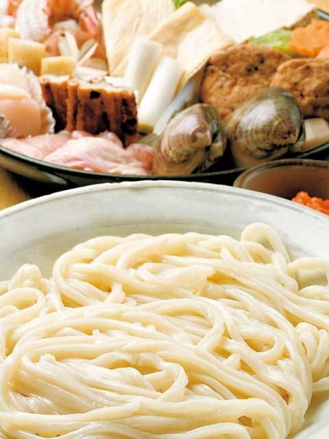 大阪のうどんすきは、太打ちうどんと具をだしで煮込む料理で、「美々卯」の登録商標。新鮮なエビやハマグリなどの海産物や季節の野菜がふんだんに盛り込まれ、だしとうまく調和している。