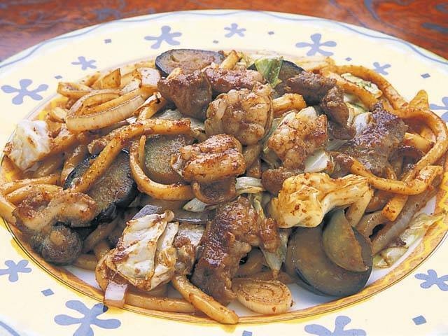 津山地方のご当地グルメ。国産牛の小腸、大腸、ミノ、ハツ、センマイなどを混ぜたミックスホルモンとうどんを大きな鉄板で調理し、焼きうどんに仕上げる。味付けは味噌や醤油系のタレが基本。